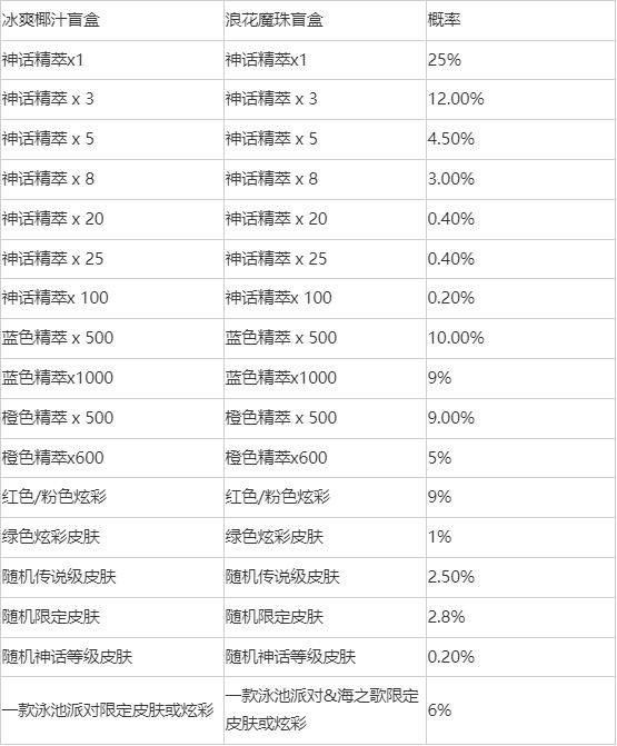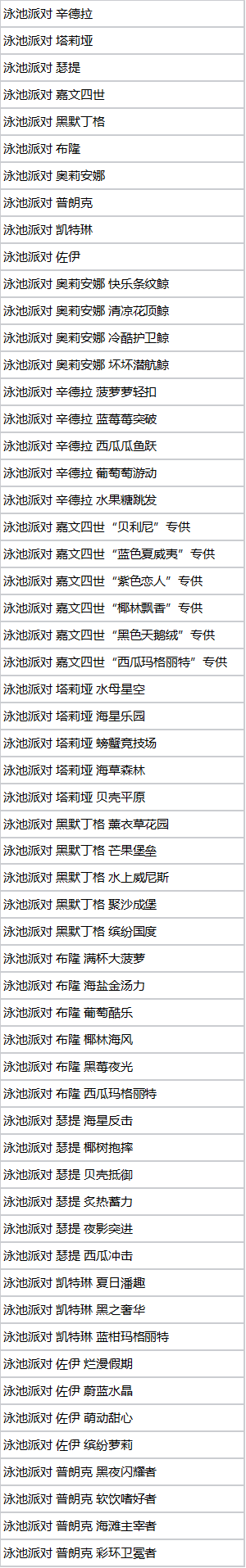 通过解锁【冰爽椰汁宝典】或【浪花魔珠宝典】,可获得【泳池派对&海之歌限定皮肤宝箱】一个(奖池详见附录一),内含随机一款优先未解锁泳池派对及海之歌系列限定皮肤。(若玩家在打开宝箱时已经解锁所有泳池派对及海之歌限定皮肤宝箱奖池内皮肤,则获得【随机皮肤宝箱内】一款皮肤。(优先未解锁)