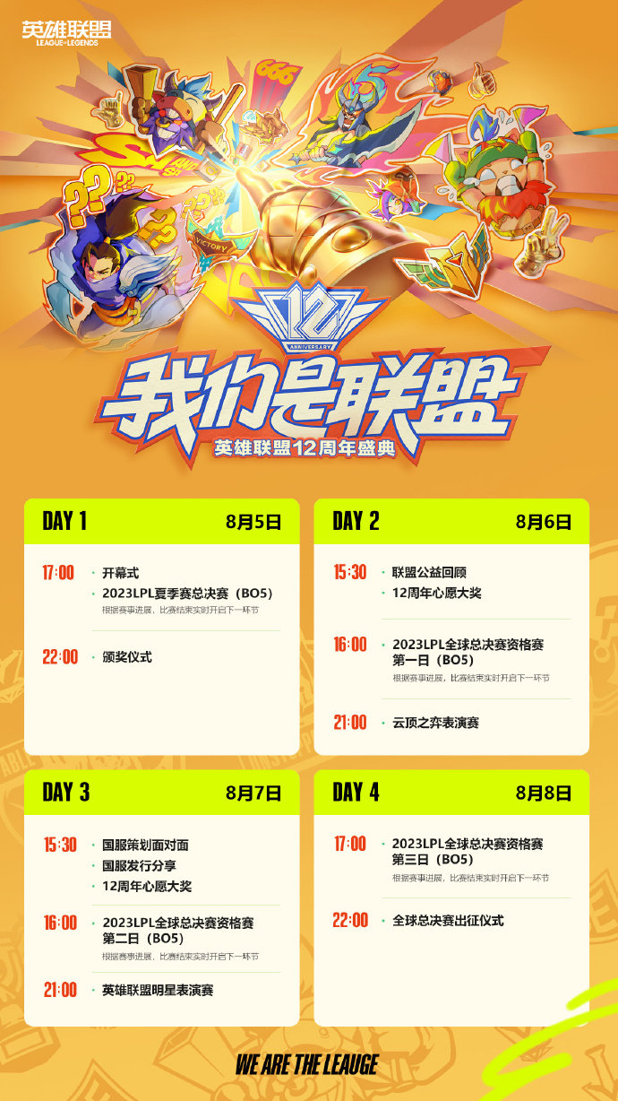 随着夏季赛走向尾声,我们正式向召唤师们发出邀约:8月5日至8月8日,2023英雄联盟12周年盛典将在西安曲江竞技中心正式拉开帷幕。其中,2023LPL夏季赛总决赛将于8月5日打响,LPL赛区全球总决赛资格赛将于8月6日至8月8日上演。