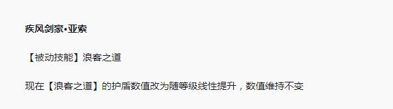 现在【浪客之道】的护盾数值改为随等级线性提升,数值维持不变