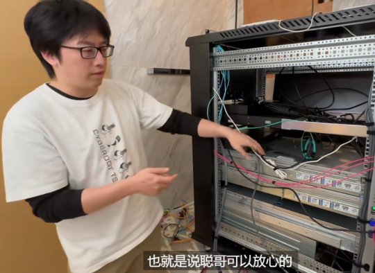 科技UP主身着王思聪热狗T恤,在改造中也替换了服役时间较长的UPS不间断电源,同时升级到华为全光**换机。