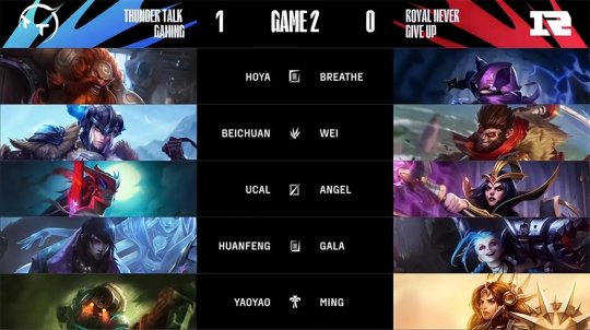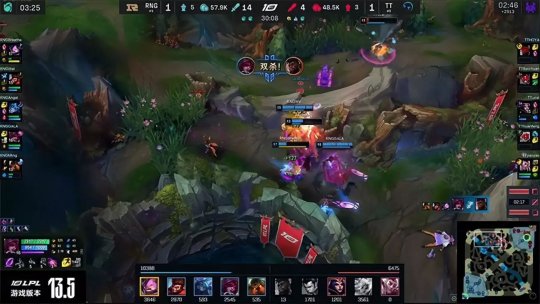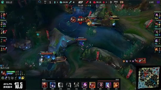RNG双人组对线发挥出色,打残厄斐琉斯和泰坦以后直接推线进塔,猴子前来协助击杀泰坦拿下一血。下路遭重的TT开始疯狂军训上路凯南,连续三次将其击杀,RNG则继续围绕强势路主打下半区,先后拿到三条小龙拉开了经济差距。TT不依不饶继续在上路推进二塔,RNG拿到听牌龙以后全员向上路集结,找到机会主动开团斩杀TT三人想要拿下刚刚出生的大龙,TT双人组殊死阻挠将RNG劝退。TT队员复活以后赶到龙坑想赌一波RNG队员回补的时机偷掉大龙,可是RNG早有准备就在野区附近与TT开战,金克丝在队友的保护下打出爆炸伤害,RNG再次0换3击溃TT成功拿下大龙。