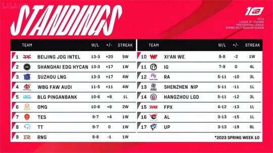 历经十周,2023LPL春季赛常规赛顺利收官,JDG、EDG、LNG、WBG、BLG、OMG、TES、TT、RNG、WE十支战队成功锁定季后赛席位。群英争魁,云涌银龙现,季后赛战斗升级,3月30日精彩继续,无畏竞巅峰!