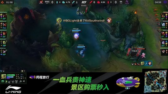 蔚三级抓下协助老鼠拿到烈娜塔一血,纳尔与鳄鱼对线激情换血差一点点完成单杀,把鳄鱼赶进了自家野区,WBG合围过来以后妖姬收下了鳄鱼的人头。阿狸前往上路抓死纳尔的同时霞和老鼠互换人头,洛反向逃跑失败被防御塔带走。接下来猪妹开始频繁进攻下路帮助霞收割大量人头,压制了老鼠的发育。RA中野也在非常活跃地到处支援寻找机会反打,双方前期的对拼非常激烈。老鼠加洛的隐藏开团让WBG防不胜防,双方的团战几乎没有丝毫停歇开启大乱斗模式,老鼠洛又在中路偷死霞以后RA凭借蔚与阿狸的收割打出1换3。WBG开始在线上布置真眼限制老鼠,放出先锋撞掉中路一塔,依然拥有微弱的经济优势。