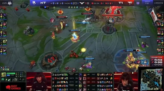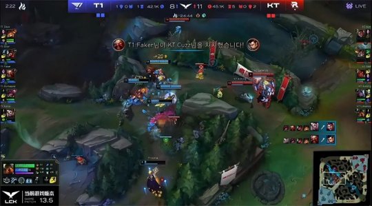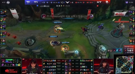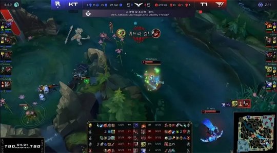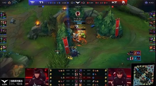 中期T1利用兵线和视野优势,进入最为擅长的拉扯运营阶段,抱团打大龙引来KT众人后果断放手,马不停蹄抢占了小龙河道的视野,如愿解锁炼金龙魂。25分钟T1再度打大龙逼团,Cuzz的猴子开W下龙坑抢到大龙!Oner的大纳尔拍回两人,KT卖掉上、中保住了三个“龙种”,暂时稳住了节奏。T1推掉中路水晶,双方经济差超过了1万。奎桑提孤身进入KT蓝buff野区当“人肉视野”,一夫当关劝退KT众人,T1得以轻松地拿到远古巨龙。最终T1平推上路高地,摧枯拉朽打出0换5团灭KT一波结束比赛,1-0先下一城!