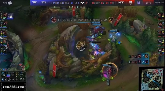 前期双方中、下两路打得有来有回,T1转而尝试从上路打开局面,Zeus的奎桑提升到7级先手Q抬回贾克斯,完成了对位单杀,猴子想要反杀奎桑提时盲僧赶到,T1上野越塔打出0换2,盲僧控下土龙加峡谷先锋节奏起势。这一场T1上中野的联动技高一筹,盲僧先后抓死了小法师和贾克斯,猴子晚来一步无功而返,随后T1下路线杀了蕾欧娜,三线局面一片大好。15分钟T1抱团控下炼金小龙,没有闪现的小法师第三次阵亡发育炸裂,KT在上半张地图劣势太大节奏哑火。大龙出生前T1推掉三路一塔,KT经济落后6千。