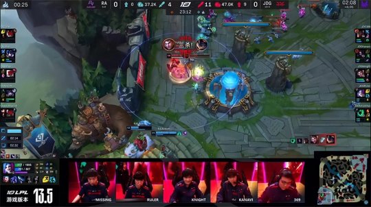 奎桑提单带下路时打出永恩的盾弓被动,兰博赶来开大尝试留人,奎桑提开疾跑扬长而去。JDG正面趁机破掉RA中、下两路水晶,拥有了两路超级兵线的优势。RA抱团在中路集火带走了锤石,可是已经交了多个大招,无力再接后续团战,加上超级兵的压力很大,无奈目送JDG无压力收下大龙。23分钟JDG携带大龙buff兵线平推上路高地,RA的集火目标转为金克丝,不过JDG的保护相当到位,金克丝稳健拉扯全身而退,杰斯poke伤害拉满斩获三杀,JDG打出0换3一波结束比赛,1-0先下一城!