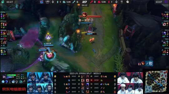 回到蓝色方的LNG复刻了第一把的“剧本”,大树刷到3级和娜美入侵iG蓝buff野区,打出赵信的闪现。前期LNG中、下两路手握线权,大树得以控下土龙。10分钟娜美游走到中路,帮小炮拿到阿卡丽的一血。