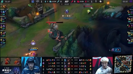 开局Dove的瑞兹出现了严重的对线失误:1级直接被逼出经验区,Scout的安妮22刀时,缩在塔下的瑞兹只有8刀。LNG的“卢娜”组合推完兵线和盲僧入侵iG蓝buff野区,不让瑞兹吃塔下兵,随后抓死了掩护瑞兹吃线的佛耶戈,iG中野节奏炸裂。