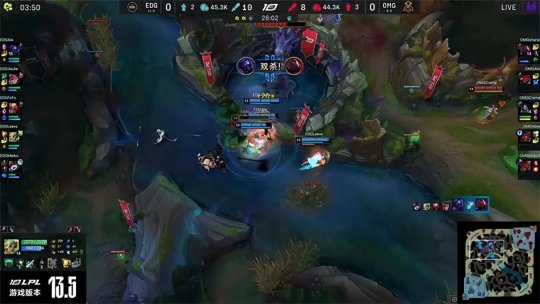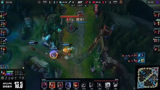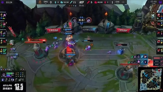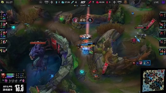 EDG开始在上半区布控视野,大树靠近河道遭遇安妮闪现开团瞬间被秒,EDG立刻动手开打大龙,OMG众人前来阻止但没有任何机会,EDG稳稳拿下大龙Buff并且开团斩杀鳄鱼,随后推掉中路二塔。回城休整过后EDG强势推进高地,凭借之前积累的装备优势轻松开团击溃OMG,一鼓作气在25分钟就推平基地结束了比赛,恭喜EDG 2-1战胜OMG,继续领跑LPL积分榜。