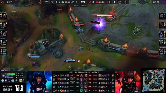 2023 LPL春季赛常规赛第九周第五日,EDG战队对阵OMG战队,目前位居LPL榜首的EDG战队无论是前期运营还是团战协作能力都非常顶尖,虽然在第二局因为前期劣势太大被OMG扳平比分,但EDG还是展现出强大统治力,通过稳健的团战发挥2-1战胜OMG,稳固了自己的榜首地位。
