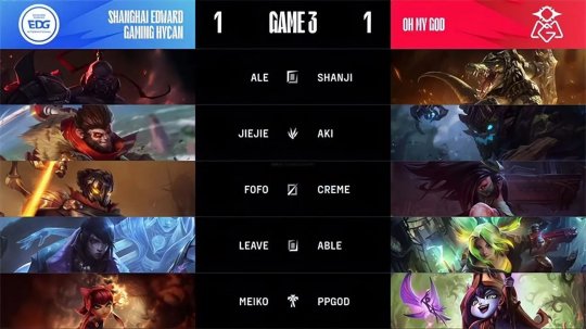 EDG集结五人抱团抓上,塞拉斯有些上头的一打五惨遭终结,把巨额赏金让泽丽拿到。接下来EDG故技重施想要通过埋伏创造局部的人数优势,脸探草丛的蔚遭遇集火但是有璐璐保护极限生存下来,OMG立刻发动反击,凭借之前积累下的巨大经济优势轻松斩杀EDG四人,进一步巩固了胜势。22分钟火龙魂团战,OMG直接先手开团把吸血鬼控死,凯南天雷进场毁灭了EDG后排输出的空间,OMG全面碾压0换3击溃EDG以后轻松收下火龙魂以及大龙Buff。OMG不紧不慢回城补给,随后推掉中下高地。EDG在上路防守时找到仅有的机会强开秒掉了厄斐琉斯,可是OMG上中双C依然打出了足够爆炸的输出,1换4击溃EDG以后一波结束比赛,扳平了比分!