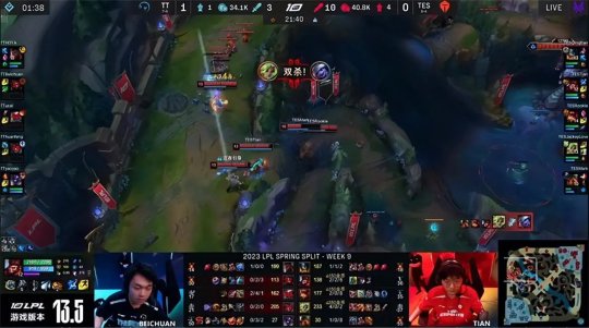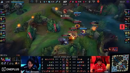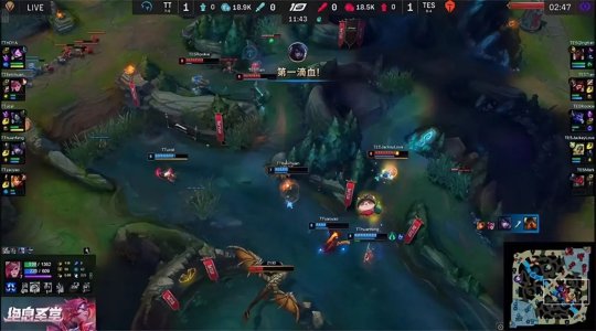 这一场TT背负着巨大的进攻压力,TES则稳健发育尽力避战。猴子gank上路时打出凯南的闪现,不过凯南的闪现转好之后TES还是选择放掉第二只先锋。TT急于推掉中路一塔,又把先锋放在中路牵制TES,回身抢占了小龙河道的位置。TES击杀了先锋之后抱团进小龙河道探视野,阿卡丽从侧翼切进TES后排,在吃到虚弱的情况下伤害依旧拉满,TT得以打出1换3并控下火龙在,作为交换TES推掉下路一血塔。大龙出生后TES在上路河道抓死了蕾欧娜,龙王拿到人头发育良好,双方经济持平。