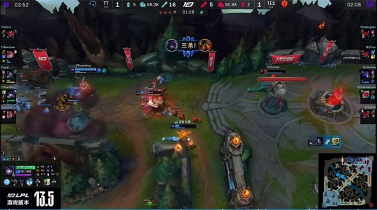 TES吸取了上一把的教训,在BP中补强了上、辅两个位置,前期TES上、下两路如愿手握线权。5分钟TES野辅蹲在TT下半野区等一个“有缘人”,牛头吃到泰坦的钩子就地反开,安妮先于小炮赶来支援,闪现R拿到一血,小炮W跳脸收掉猴子,还打出泰坦的闪现。