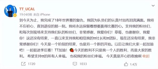 赛后ucal更新了个人微博,表达了对于粉丝、队伍及女友的感谢: