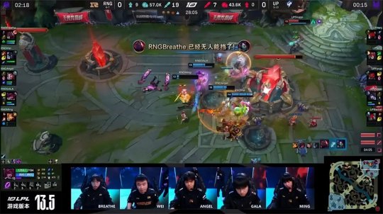 UP抢先落位开打第二只先锋,机器人先行钩中赶路的泽丽,压低了泽丽的血量,导致UP正面是四打五,赵信拼惩戒抢到先锋,RNG则集火秒掉剑魔。大龙出生前UP把先锋放在中路,RNG重兵集结一路追击,扛塔打出0换4大获全胜!UP中、下两路水晶失守,无奈目送RNG“听牌”了土龙魂,经济落后8千。UP选择在中路抱团主动求战,击杀了RNG上辅后尝试开大龙,Wei的盲僧下龙坑E接咳血战斧打到五人AOE拉满,UP全员状态较差只能后撤,GALA的金克丝无人限制斩获伪四杀,RNG打出0换5团灭UP一波结束比赛,2-0送给UP六连败!