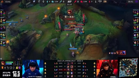 前期RNG野辅节奏拉满:入侵UP红buff野区时蹲在草丛等赵信路过,再双游中路抓死了猝不及防的瑞兹,盲僧马不停蹄赶往上路,帮赛恩带走了剑魔。UP处处受制节奏哑火,RNG无压力控下了火龙。赵信尝试gank下路,不过泽丽向前的E技能暴露了自己身后有人的讯息,RNG下路组的演技相当精湛,拉扯了数分钟之后赵信才回城,随后RNG付出赛恩的代价拿到峡谷先锋,盲僧抓住瑞兹没有闪现的破绽抓中得手。14分钟UP野辅双游中路,RNG野辅支援赶到化解了危机,同时金克丝单吃了下路一血塔。