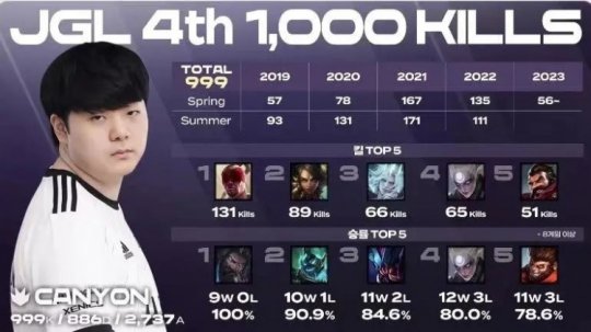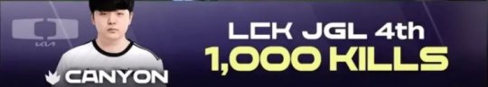 在2023LCK春季赛常规赛第二轮DK vs NS的第一局比赛中,打野Canyon选手达成LCK1000击杀,成为第四位达成1000杀的打野。