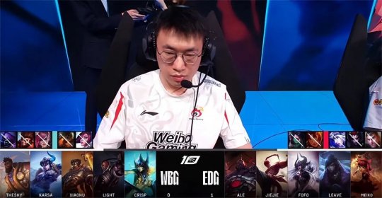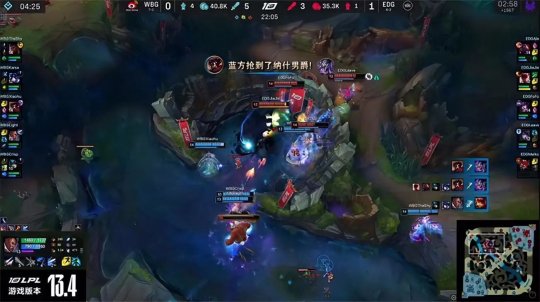 中期EDG抱团偷大龙时被发现,Karsa的猪妹闪现进龙坑下惩戒,配合Xiaohu维克托的伤害再次抢到大龙!WBG势如破竹打出0换3,EDG上、中路二塔告破,双方经济差来到8千。24分钟WBG耐心地慢慢磨掉EDG中路高地塔的血量,盲僧摸眼回旋踢时被卢锡安的狂风化解,WBG集火反杀盲僧,连破三路高地塔扬长而去。最终WBG在EDG蓝buff野区打出0换5一波结束比赛,1-1扳平了比分!