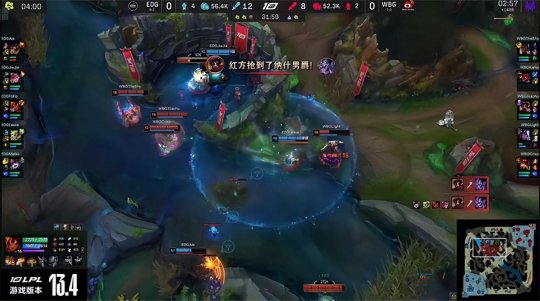 前期猪妹控图、gank两不误:帮助维克托抓死了激进压线的辛德拉,期间还控下火龙加峡谷先锋,放在下路撞掉EDG一塔的镀层。Light的卢锡安回城做出狂风之力,在娜美的帮助下线杀了落单的厄斐琉斯,顺手推掉EDG下路一血塔。盲僧见WBG在下半张地图风生水起,转而gank上路抓死了奎桑提,作为交换猪妹控下小龙,“卢娜”组合又在中路越塔强杀了刚刚复活的厄斐琉斯,EDG节奏哑火处处受制,只能放掉第二只先锋。大龙出生前WBG通关了下路,EDG经济落后4千。