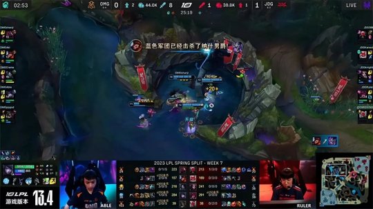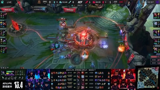 2023 LPL春季赛常规赛第七周第七日,JDG战队对阵OMG战队,第一局JDG前期建立巨大优势,虽然中期团战非常混乱两度遭到团灭但还是拿下了比赛。第二局第三局OMG在团战的发挥压制住了JDG的运营体系,最终通过戏剧性的偷家完成让一追二,2-1战胜JDG带走了胜利。