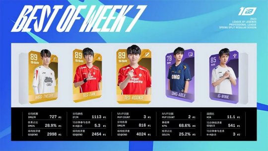 LPL春季赛第七周已经结束,LPL赛事官方公布了第七周最佳阵容:TES战队的Rookie包揽最佳中单及MVP,最佳上野及下路分别是WBG的THESHY、TES的Tian、OMG的Able和iG的Wink。EDG下路Leave荣膺最佳新秀。
