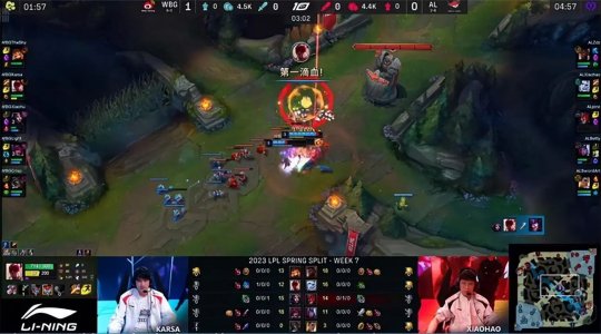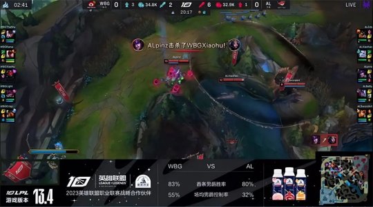 前期双方打野的gank节奏你来我往,佛耶戈抓死了WBG中、辅,盲僧则频繁往返于中、下两路,打断了佛耶戈的节奏,期间还控下炼金小龙加峡谷先锋,放在下路撞到AL一塔的镀层。13分钟佛耶戈抓下时被盲僧反蹲到,WBG打出0换2再控海克斯小龙。AL不甘示弱开始抱团,在上路河道终结盲僧,拿到第二只先锋稳住了节奏。WBG先行换线拉扯,霞换到中路推掉一血塔,作为交换AL放出先锋撞掉下路一塔。大龙出生前WBG在下路河道打出0换4,“听牌”了风龙魂大获全胜!
