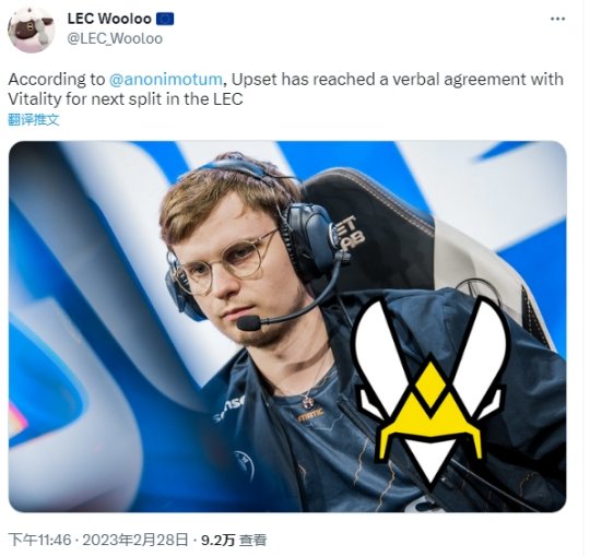 据外媒Blix.GG爆料,前FNC战队AD选手Upset已经和Vitality战队达成口头协议,Upset将在春季赛为Vitality战队效力并成为队伍新的首发ADC。