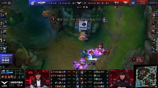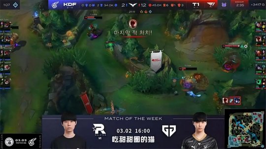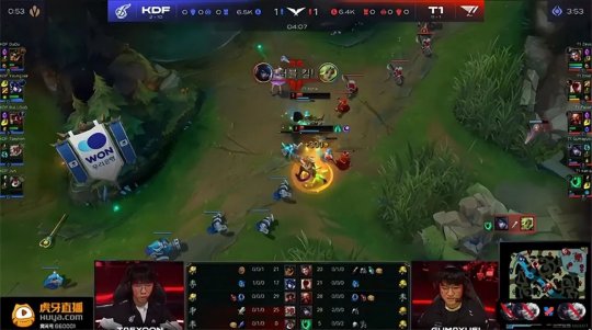 KDF通过大树的疯狂游走Gank总算是抓到T1的激进取得几个击杀,暂时遏制住了差距被再度扩大。然而T1依然手握绝对优势的领先。有条不紊地收割资源等待新的机会出现。终于是KDF按捺不住在中路尝试集火韦鲁斯但他们忘记了卡莉斯塔大招的救人能力,T1顺势发动反击将KDF击溃。第三条小龙刷新以后T1凶猛攻势追杀KDF斩掉三人以后顺势收下大龙Buff,小炮抠脚操作尝试单杀酒桶惨遭反杀,幸好有TP支援的奎桑提将酒桶收掉。T1队员补给状态准备发动推进,但蜘蛛在野区大意被控遭到击杀,T1选择稳妥起见只推掉中路高地,再回城修整准备下一轮进攻。