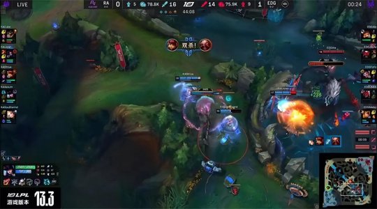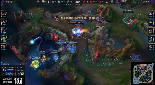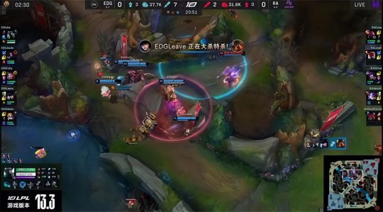 RA下路的劣势很快辐射到上半张地图,EDG抱团入侵RA下半野区,又抓死了落单的盲僧,然后转线中路掩护女警推掉RA中一塔。大龙出生前EDG在中路摆好炮台和架子,集火带走了赛恩,回身稳稳地“听牌”土龙魂。RA拿到第二只先锋撞残了上路一塔,经济落后5千。中期RA野辅在大龙河道先手开到眼上顿的蜘蛛,Jiejie的蜘蛛飞天接火箭腰带全身而退,EDG再次击杀RA野辅打出0换2,如愿将大龙收入囊中!RA的剩余外塔尽数告破,EDG的大龙收益为4395。最终EDG在大龙河道打出1换5团灭RA一波结束比赛,“温水煮青蛙”1-0先下一城!