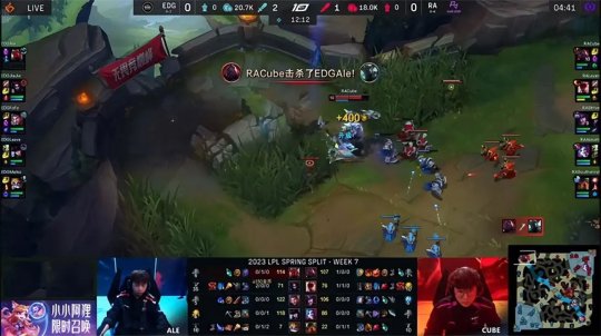 这一场RA的女警体系磨合得不太理想,女警前两个Q直接打小兵抢线权,拉克丝Q完蕾欧娜之后遭到反开,蕾欧娜交引燃打出拉克丝的双招,EDG下路夺得线权。蜘蛛在上路现身,迫使纳尔退到EDG二塔前的“自闭草丛”。酒桶则灵性入侵RA下半野区,和杰斯前后包夹打出安妮的闪现完全不亏。