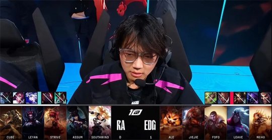 青钢影换线到下路单带时惨遭EDG中野辅集火秒杀,永恩传送落地“一死一送”,EDG稳稳地“听牌”了水龙魂。大龙出生前RA上、下路一塔失守,经济落后4千。中期EDG抢先落位小龙河道,尝试绕后的青钢影被纳尔闪现留下,EDG集火将其带走,无压力解锁了水龙魂。24分钟RA在自家红buff野区付出打野和下路三个大招的代价,仅逼出猴子的W技能,纳尔一直在大龙坑上方盯防猪妹,EDG得以控下大龙。RA上、中两路水晶告破无力回天,EDG平推中路一波结束比赛,有惊无险2-1击败RA!