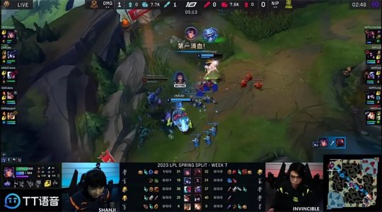 这一场NIP上单Invincible充分发挥了英雄属性优势,他的剑姬抢到2级直接越兵线压制奎桑提,shanji的奎桑提被戳成丝血,只能在塔下“坐牢”,连兵线的经验都吃不到。剑姬把奎桑提打回城之后吃到2层塔皮,OMG则是中、下两路手握线权,猴子得以控下海克斯小龙。