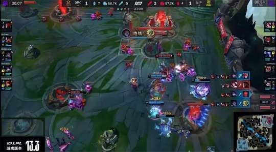 前期Aki的猴子一如既往的“隐身”,升到6级之后也没有通过gank帮助队友打开局面,而NIP的控图节奏良好,先在上路河道打出2换2,抢到了峡谷先锋,然后瑞兹掩护赵信控下炼金小龙,赵信再去下路放先锋撞镀层,节奏一气呵成行云流水。OMG最大的优势在于上路,shanji的奎桑提不但压制了鳄鱼的发育,而且还单吃了上路一塔,不过NIP下路组抢先推掉一血塔。大龙出生前OMG利用上路的线权优势拿到第二只先锋,作为交换NIP控下火龙。