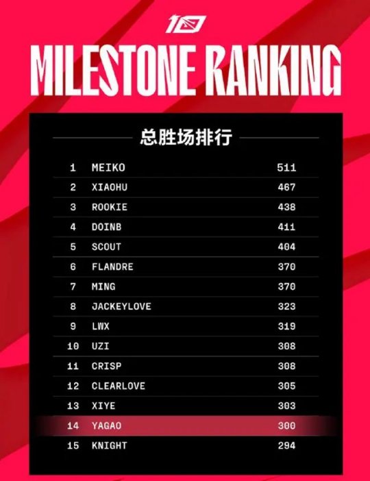 目前LPL总胜场排行榜的第一名是EDG辅助Meiko,他也是榜单上唯一胜场数超过500的选手,WBG中单Xiaohu紧随其后,前五名中有四位中单。Yagao目前的总场数仅落后于自由人xiye,有望在今年春季赛跻身前十。