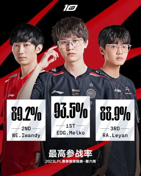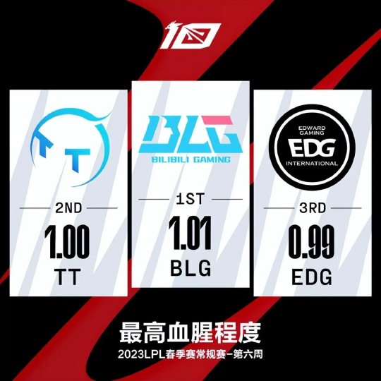 LPL春季赛第六周已经结束,英雄联盟赛事数据官博统计了一系列的趣味数据:最高单杀——UCAL、Breathe、369(3);最高KDA——Ming(59);最高参战率——Meiko(93.5%);最高血腥程度战队——BLG。