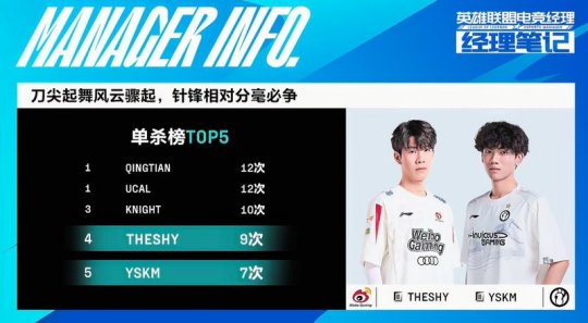 其中TheShy9ci单杀位列第四,而YSKM也以7次单杀紧随其后。