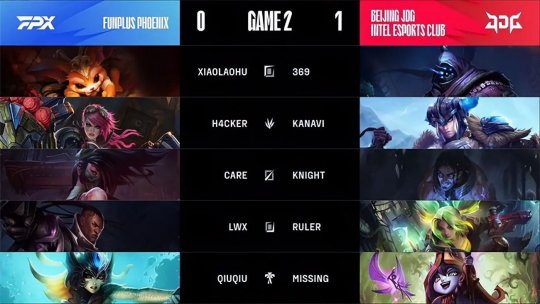 14分钟已经手握一万经济领先的JDG完全掌控了比赛的走向,直接在上路抱团推进高地,强杀卢锡安以后拆掉上路高地,见没有机会继续推进决定暂时后撤,FPX追出高地想要寻找反打的机会,JDG立刻顺水推舟发动反击,一路追杀到泉水门口将FPX彻底击溃,在18分半就推平基地结束了这场差距空前悬殊的比赛,恭喜JDG 2-0轻取FPX!