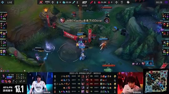 2023 LPL春季赛常规赛第六周第二日,WBG战队对阵IG战队,S8冠军上单THESHY面对老东家,大赛经验非常丰富的WBG选手们无论是个人操作还是运营实力都胜过了年轻的IG战队,连续两局比赛WBG都把握住优势稳稳拿下胜利,2-0击败IG。