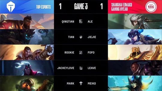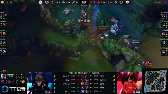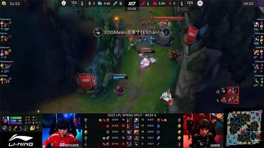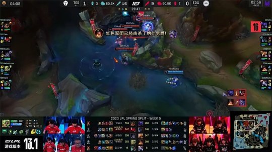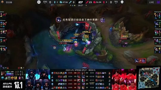 2023 LPL春季赛常规赛第五周第七日,EDG战队对阵TES战队,两队目前都是5胜1负状态火热,在比赛中也是棋逢对手打的非常胶着,第一局比赛EDG下路陷入劣势,依靠沙皇的操作一度在中期占据上风,但TES很快调整战术精准针对拿下了比赛胜利,第二局TES依然从下路撕开突破口,屡屡在野区开战得手,EDG稳住阵脚稳健拉扯运营最终利用TES决策失误完成翻盘。决胜局双方在前中期一度有来有回非常胶着,而TES牢牢把团战主动权掌握在手里,两波果断的大龙决策迫使EDG露出了破绽,最终TES 2-1N拿下比赛胜利。