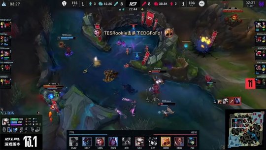 半血猴子在河道徘徊突遇TES下野爆炸果实跳进河道,虽然交出闪现但还是被韦鲁斯跟闪拿下了一血。接下来TES不断找到机会制造击杀,帮助下路建立了优势,EDG只能以防守为主,控到前两条小龙资源,缓解压力的同时等待着破局的机会。19分钟左右烬的致命华彩控到韦鲁斯以后赛恩立刻开车带领EDG越塔开团,但大头反手RE控到两人,TES上中野支援进场打出2换4,进一步拉开了差距。随后TES在河道又与EDG战成1换1并收下了第三条小龙,打断了EDG的小龙节奏。