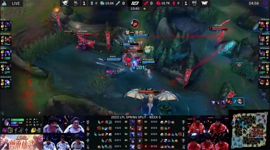 AL抢先落位开打小龙,贪心的WE还想争夺,艾希的先手大招命中大发明家,猴子补伤害拿到一血,AL以多打少打出1换3,可是并没有控小龙,WE众人复活之后还是控下了风龙,蔚放出先锋撞掉AL下路一塔的镀层进行止损。15分钟AL推掉下路一血塔,双方在小龙河道展开拉扯,烬开大后“四大皆空”,AL全员状态很好接盘了土龙,瑞兹开大带队友一路追击,打出1换2节奏起势。大龙出生前卡萨丁和酒桶分别单吃了AL上、下路一塔,不过WE的经济还是落后2千。
