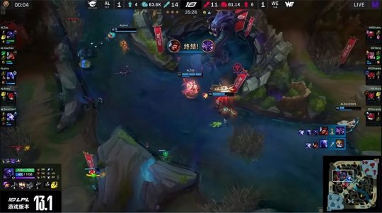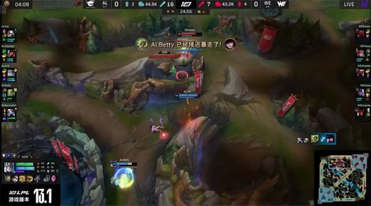蔚刷到3级选择gank下路,不料AL中野及时支援赶到,背靠防御塔四打二打出2换3,WE三人全部阵亡。猴子见状抓上得手,孤立无援的贾克斯无奈倒地,作为止损WE抱团控下炼金小龙加峡谷先锋。前期WE的推塔节奏很好,韦鲁斯和女警早早地推掉AL下路一血塔,再换线到中路掩护先锋撞掉AL一塔的镀层。AL被动换线防守,主动权一直在WE手中,AL接连放掉了火龙和上路一塔。14分钟猴子带猫在上路河道先手开团,AL上中野控制combo拉满,打出0换2推掉中路一塔稳住了节奏。WE转而掩护瑞兹推掉下路一塔。