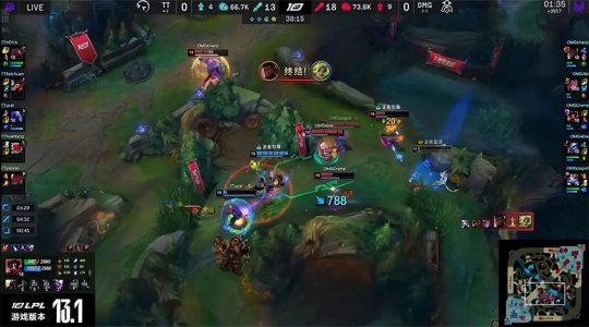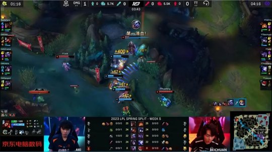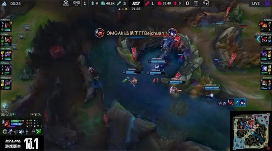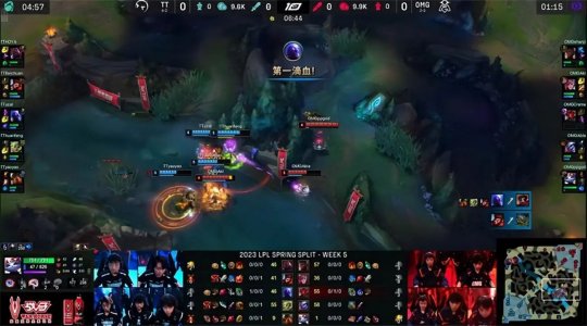 开局6分钟TT抢先落位小龙坑开龙,OMG晚来一步并且阵型分散,落单的小炮被TT集火打出闪现,残血回城无力输出。OMG中野辅“迷之决策”继续观望,猴子稳稳地控下炼金小龙后TT中辅先手开团,OMG中野接连倒地,瑞兹收获双杀梦幻起飞~