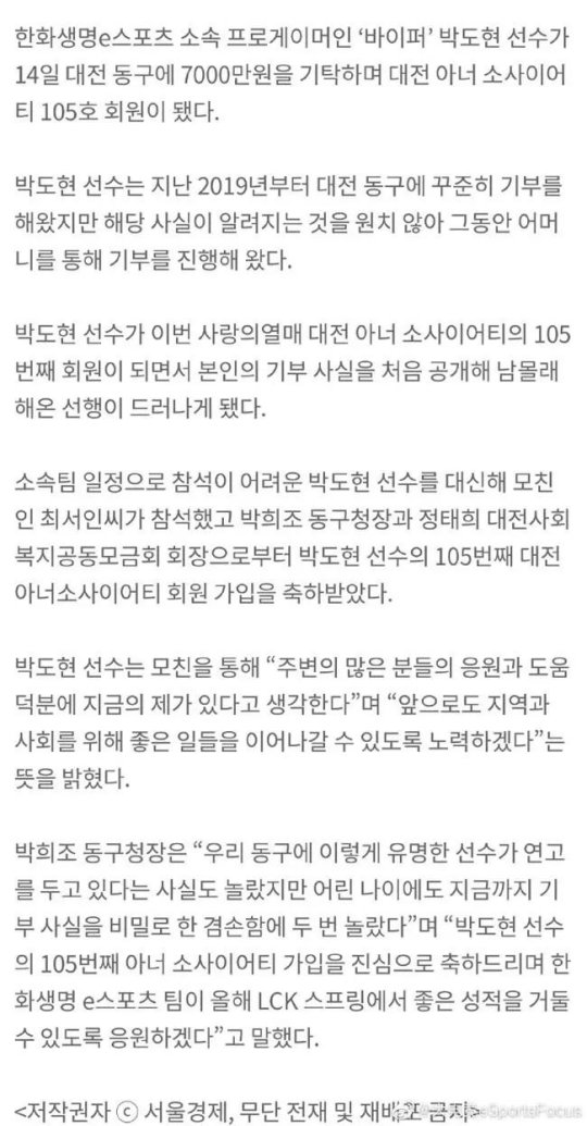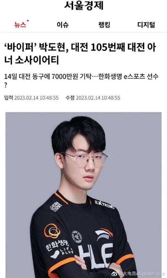 北京时间2月14日,LCK赛区HLE战队的明星ADC选手——原S11全球总决赛冠军EDG成员Viper向韩国大田东区捐款7000万韩元(约38w人民币),成为大田第105位大田Honor Society会员。韩媒报道称Viper从2019年开始一直向大田东区捐款,但由于不希望相关事实被公开,所以一直通过母亲进行捐款。