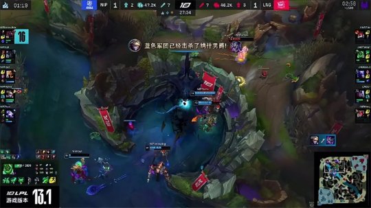双方争夺的重心转移到上半区,LNG竭尽全力处理掉大树和凯南,但是大天使瑞兹输出拉满带领双人组斩杀LNG四人。NIP休整好状态又在野区抓死了泰坦,随后通过大龙逼迫LNG前来接团,LNG第一时间集火处理掉瑞兹,可是付出了双C阵亡的代价,NIP孤注一掷强行拼惩戒击杀了大龙,击退了LNG的反扑成功撤退。NIP携带大龙Buff大兵压境席卷而来,蚕食掉中路高地以后尝试开团但没有得手,双方再度陷入拉锯战,NIP先后取得炼金龙魂以及第二条大龙,终于向LNG的基地发起了总攻,顺利推平基地拿下了第一局比赛的胜利,1-0暂时领先!