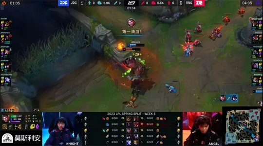 开局3分钟猪妹gank中路,knight的杰斯正好推完了兵线,一打二完全不虚,切换锤形态反杀猪妹拿到一血,蜘蛛赶来追死了阿卡丽,JDG打出0换2梦幻起飞~