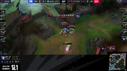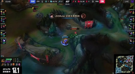 Ruler的女警轻松地单吃了中路一塔,然后孤身摸进RNG上半野区,和队友在RNG上路二塔处会合,鳄鱼开大后E进RNG的阵型,闪现Q转到三人,女警绕后完美收割,带领JDG打出0换4大获全胜!大龙出生前RNG的外塔尽数告破,JDG兵不血刃“听牌”了土龙魂。中期RNG只能在高地前清兵,JDG把全部的野区资源洗劫一空,如入无人之境。23分钟JDG开大龙逼团,打出1换4收下大龙。最终JDG带领大龙buff兵线平推下路高地,如火卷残云般虐泉1换5团灭RNG结束比赛,以2万经济差的“人机局”2-0零封RNG豪取四连胜!
