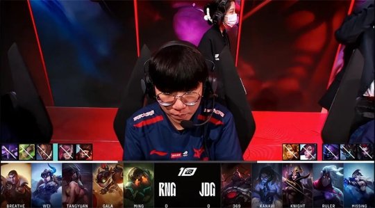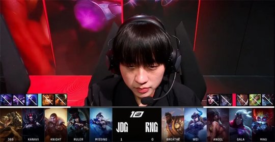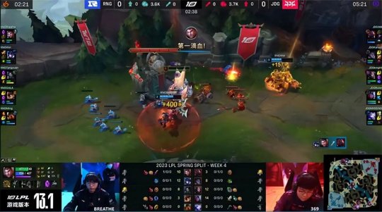 前期GALA的炸弹人在下路“坐大牢”,JDG下路组的双poke令炸弹人只能缩在塔下补兵,RNG牺牲下路的发育,换了一只峡谷先锋不算太亏,不过韦鲁斯对线爽吃了四层塔皮,还压了炸弹人30多刀,彻底打穿了下路。12分钟RNG除阿卡丽以外的四人集结在上路,放出先锋撞掉JDG上一塔,集火带走了赛恩,Ruler的韦鲁斯抢先单吃了RNG下路一血塔完全不亏,随后JDG在中、下两路频频联动,杰斯传送到下路直接“落地白给”,JDG再破中路一塔,被动防守的RNG节奏窒息。