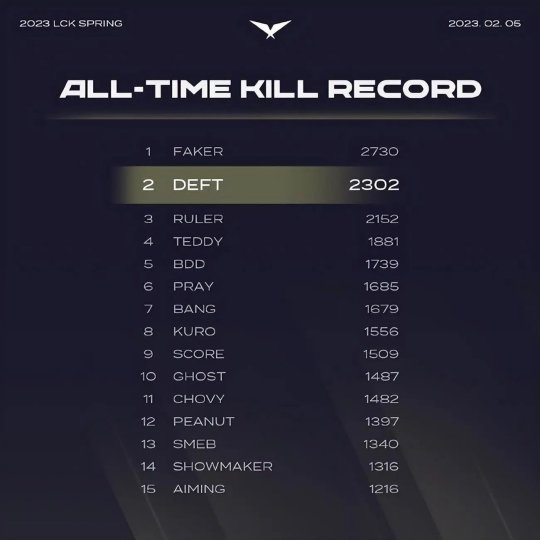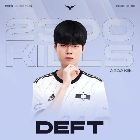 在北京时间2月5日,LCK春季赛第三周的收官战中,DK战队2-1击败KDF,赛后DK下路Deft创造了崭新的LCK里程碑——以2302次击杀数位列LCK选手击杀榜第二名!