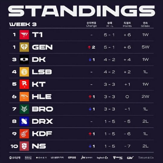 LCK春季赛第三周结束之后,积分榜上游梯队依旧是“老三样”——T1、GEN积分5-1并列第一,DK积分4-2紧随其后。GEN近期豪取五连胜,竞技状态最为火热。S12冠军选手Kingen、Zeka和S11冠军下路Viper所在的HLE排名第6,近期状态有所回升。S12冠军战队DRX积分1-5排名第8,队内的磨合还在进行中。DK将在第四周的2月9日、12日先后对阵KT、HLE,让我们共同期待届时Deft和DK的精彩表现!